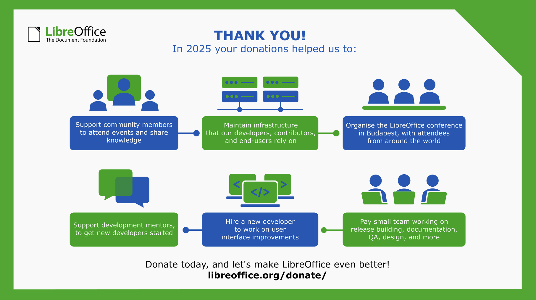 LibreOffice is only possible thanks to your donations! Here’s how they helped us in 2025 β and if you want to support our project and community, please see this page. Thank you π